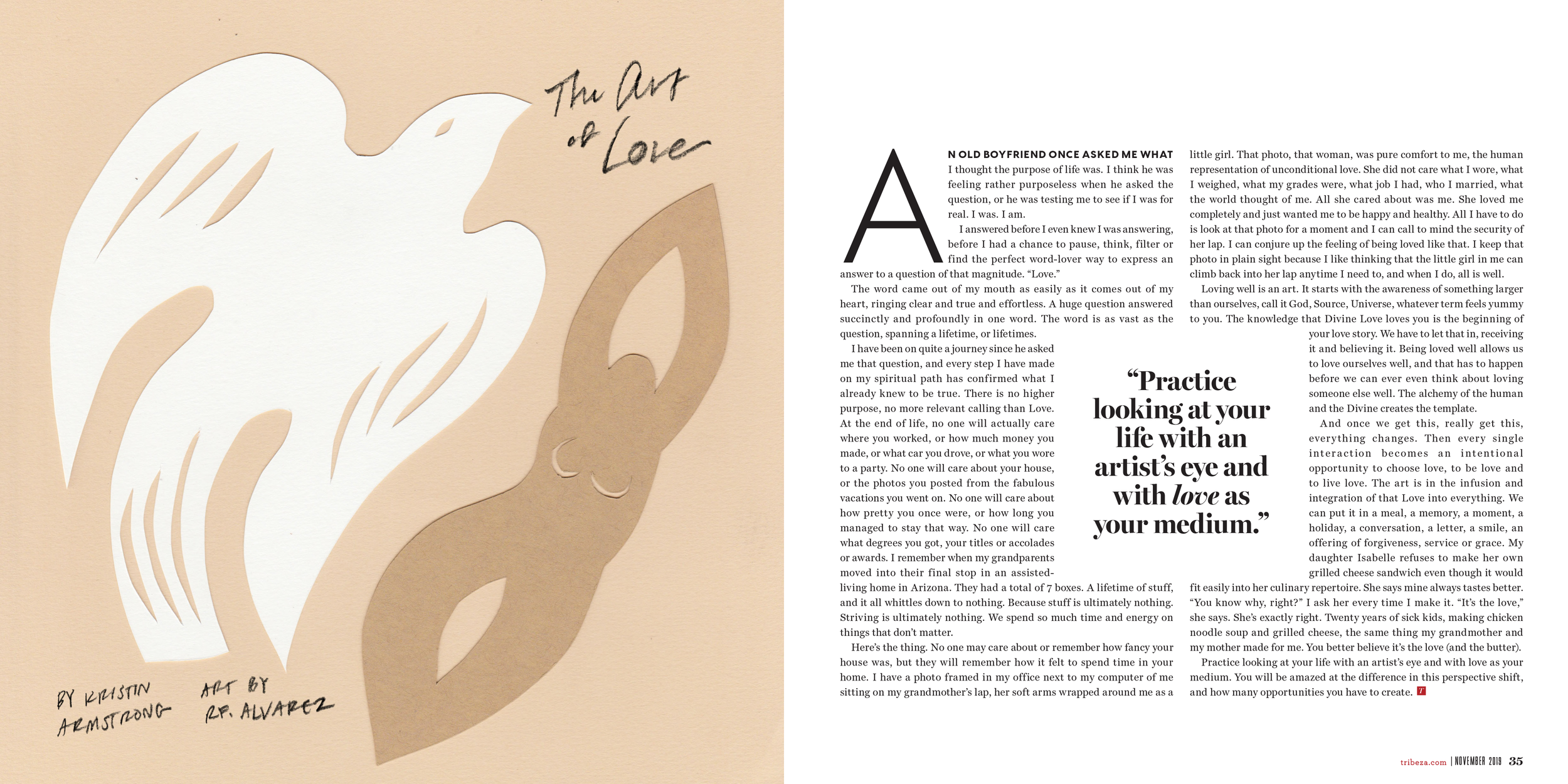 Kristin Armstrong has been writing a column for Tribeza for years. Each month an illustration accompanies her column and I had such fun art directing the illustrative work for her column the two years I worked at the magazine. I collaborated with insanely talented illustrators including Krista Perry, Hannah-Michelle Bayley, Whitney Avra, RF Alvarez, Jessica Fontenot and Kristin Moore.